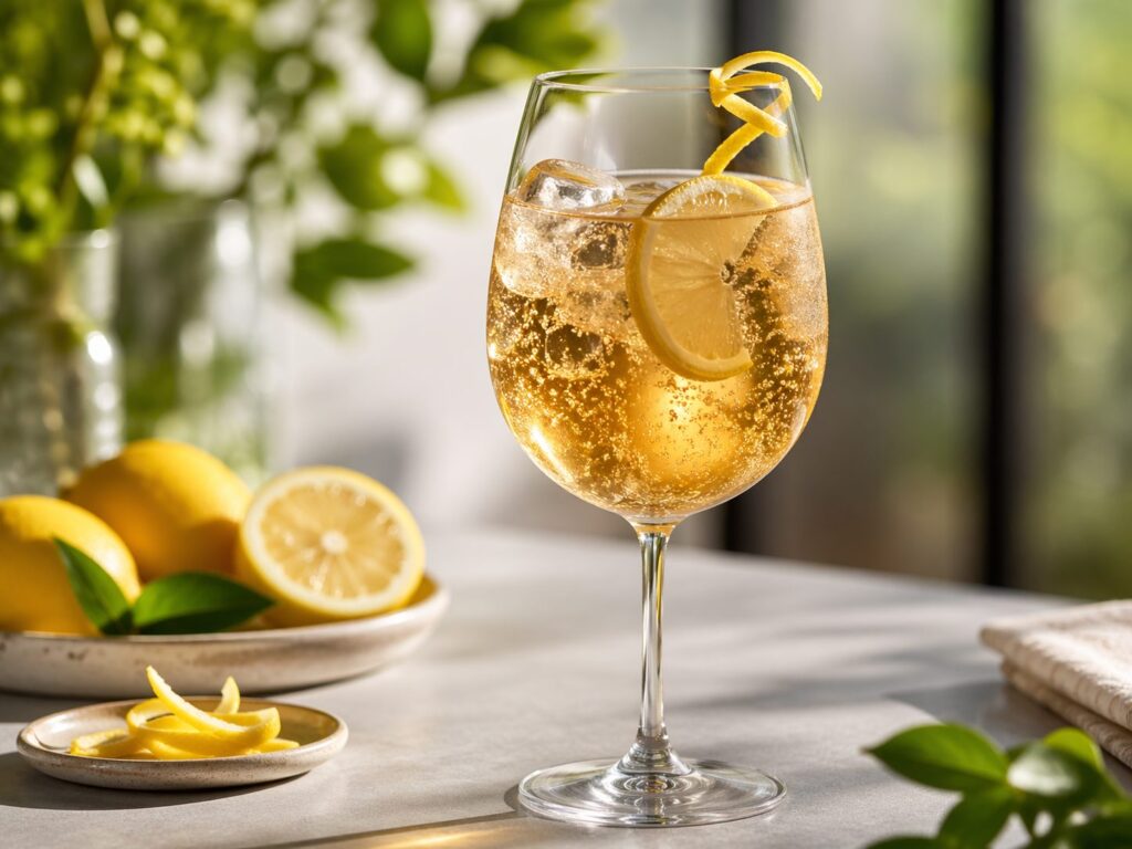 A bubbly alpine inspired spritz made with Almdudler, prosecco, lemon zest, and ice. This Almdudler Spritz is herbal, golden, lightly sweet, and refreshingly different from the usual spritz.