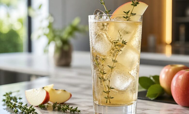 A crisp alcohol free alpine drink made with Almdudler, apple juice, thyme, and ice. This Alpen Mocktail is herbal, lightly fruity, aromatic, and perfect for brunches, dinners, or thoughtful alcohol free entertaining.