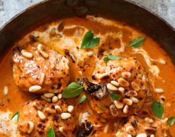 - Place the chicken meatballs, dripping juicy, onto a warm plate and pour more sauce over them. A few more flakes Piment d’Espelette and sprinkle the toasted pine nuts on top. Garnish with basil