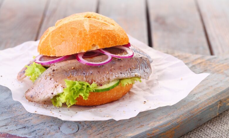 A crisp Kaiser roll loaded with peppered fish, fresh vegetables, and tangy sauce, bringing a taste of the German coast straight to your kitchen!