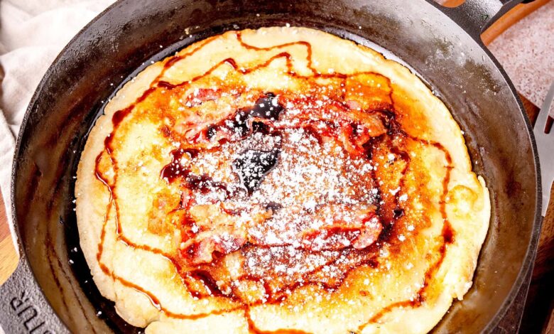 Dutch bacon pancake, in a cast iron pan, with crispy bacon.Dutch bacon pancake, in a cast iron pan, with crispy bacon.