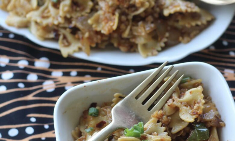 Next, everything comes together. The kasha. The pasta. The chili-crisp onions. Stirred, tossed, and coated until every bite sings. Then, for a fresh finish, a sprinkle of chopped scallions lands on top. Because obviously, this dish deserves a little green glamour.