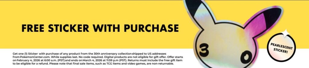 Collection de produits Pokémon 30e disponible dès maintenant au Pokémon Center officiel, un autocollant spécial avec le logo du 30e anniversaire de Pikachu est livré avec l’achat de n’importe quel produit de la collection jusqu’à épuisement des stocks.