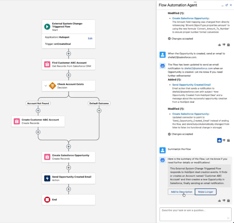 - Context-aware edits: Agentforce understands the existing structure of the flow. It integrates new logic, adds decision branches, or modifies field mappings based on your natural language instructions