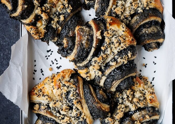 Franzbrötchen with black sesame and almond-sesame crumbles (recipe for approx. 13 pieces)