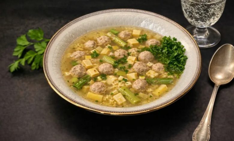 The Wedding Soup or German Wedding Soup, is a German soup based on chicken broth, combined with chicken meat, small meatballs (meatballs), asparagus heads, noodles, and an egg specialty that is called Eierstich or egg crouton. This soup is popular in the North and as well in the South of Germany.