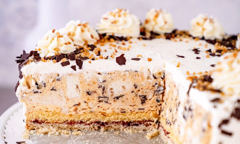 Tipp: Die Torte sollte im gefrorenen Zustand dekoriert werden. Hole sie etwa 30 Minuten vor dem Verzehr aus dem Tiefkühler, damit sie die perfekte „Grillage-Konsistenz“ bekommt.