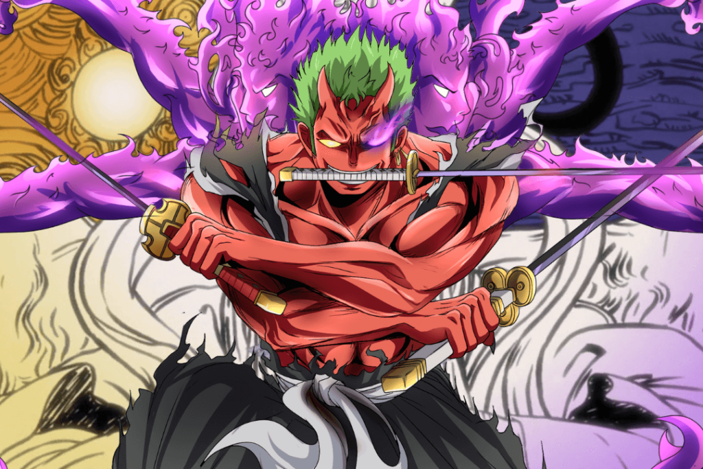 Alors que les géants démons surpris chantent autour de Zoro, ce dernier saute sur la tête, saute dans les airs pour sa nouvelle technique, “Technique secrète du style à trois épées : Traversée des six chemins”.