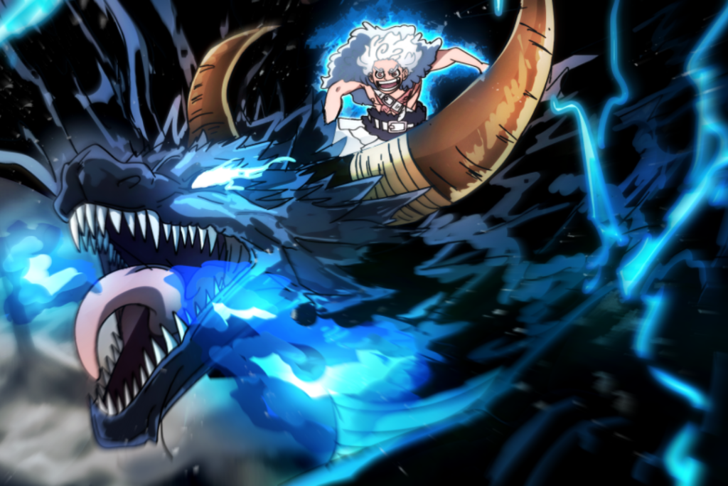 Luffy attrape un éclair d’un nuage avec sa main gauche et utilise sa main droite comme lunette de visée pour garder les yeux sur Sommers afin de créer une nouvelle technique appelée “Gomu Gomu no Dawn Thor Rifle !”