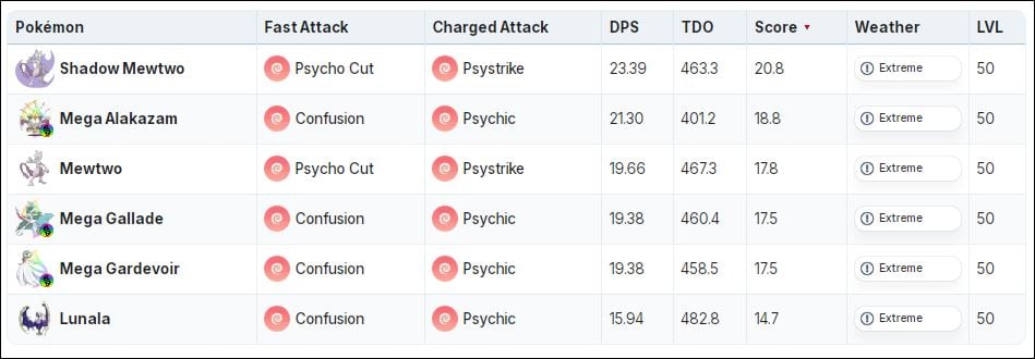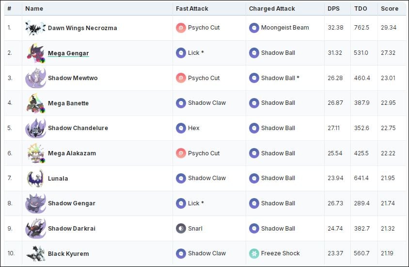 Contrairement à Solgaleo, dont l’horrible ensemble de mouvements le rend sans importance dans la méta PvE, Lunala propose des options très puissantes. Il a accès aux deux Psychique et Fantôme Attaques rapides et chargées. Cela permet à Lunala d’agir à la fois comme un Psychique ainsi qu’un Fantôme tapez attaquant de raid. Commençons par Lunala comme Psychique attaquant de raid. En utilisant notre Outil de comparaison DPS: