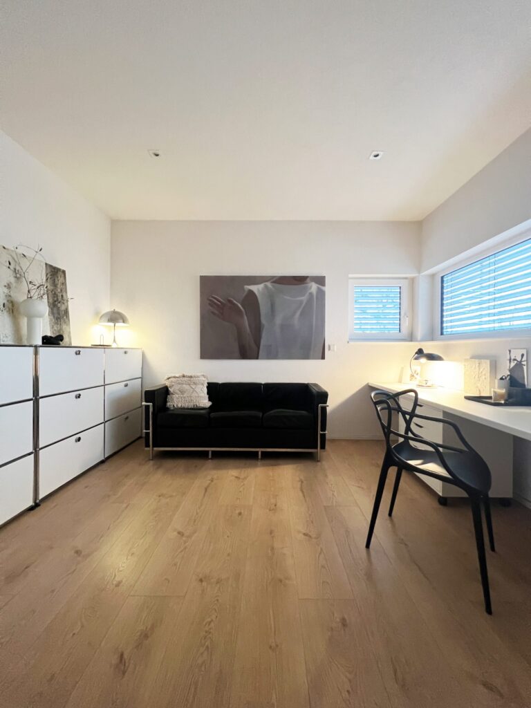 This idea becomes even clearer when you look at the specific furnishings of our ground floor office. Because a flexible room not only depends on its size, but above all on its well-thought-out furnishings. We consciously chose high-quality, timeless and functional furniture that can be used both in everyday work and when repurposed later. The storage space offers a lot of flexibility – and there is plenty of it. The tailor-made USM Haller shelves not only fit in perfectly aesthetically, but also offer enormous space for folders, technology, documents or personal items. High-quality, modular and durable – this is exactly how storage space should be when a room is designed to last for many years and for different uses. Placed on it, art objects, vases by Georg Jensen and COOEE Design, candle holders by Stoff Nagel, the timeless Louis Poulsen table lamp and works of art by Petra Lorch (www.lorch-art.de) find an elegant presentation area. For creative phases or short meetings, we have integrated a comfortable sofa – a place that deliberately offers some distance from the classic desk. This is where ideas arise, this is where people brainstorm, this is where you can switch off or have a brief change of perspective. The heart of the office, however, is the large worktop, which can easily accommodate up to three full-sized workstations and, in addition to monitors and drawers for laptops and computers, also offers space for beautiful lamps such as the classic from Kaiser Idell or accessories from Lyngby or Diptyque. The Kartell Masters chair creates an elegant contrast with its matt black color and is therefore a visual highlight. This means that the room can not only be used alone, but also, if necessary, for joint projects, temporary team situations or family members working in parallel. The room is also technically future-proof: a TV with a direct PC connection enables presentations, video conferences or the visualization of complex planning. Whether mood boards, construction plans, tables or creative drafts – everything can be displayed in a comfortable size and discussed together. All of these elements ensure that the office is now a fully-fledged, professional workspace – and yet remains flexible at all times. If needs change in the future, the room can be transformed into a cozy bedroom in just a few simple steps, without the need for any structural work. It is precisely this combination of functionality, comfort and foresight that makes planning work not just for the moment, but for decades.
