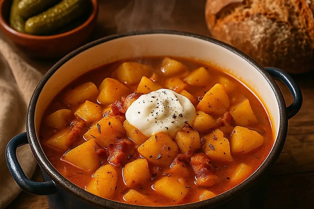 A rustic Transylvanian one-pot potato stew gently simmered with bacon, onions, peppers, and caraway until creamy and smoky—perfect with crusty bread, sour cream, and pickles.