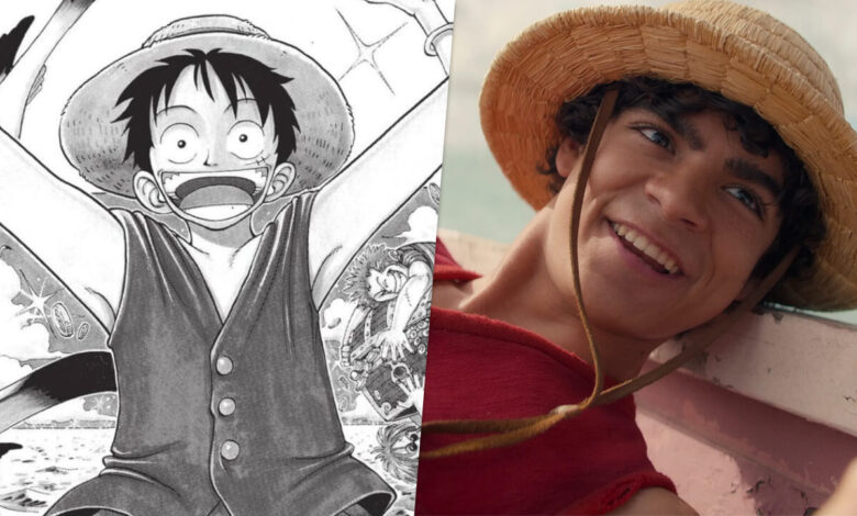 Photo : Manga Luffy (à gauche) et Inaki Godoy dans le rôle de Luffy en live-action – Shueisha / Netflix
