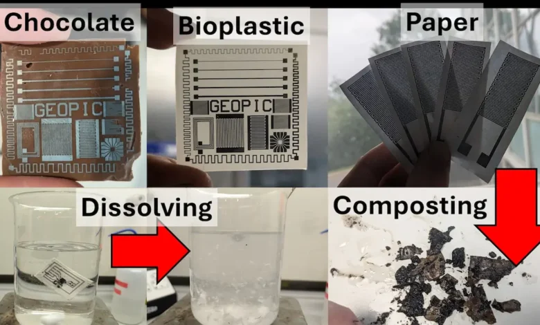 Researchers at the University of Glasgow have developed compostable circuits by printing conductor tracks on chocolate and other biodegradable materials.