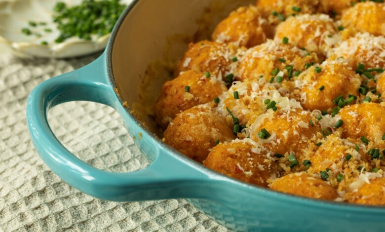 That’s why I now have these delicious dumplings made from potatoes and pumpkin. They are cooked in a creamy sauce made from parmesan and cream in the oven – just right for golden autumn days and dark nights! That’s why I’m sending the recipe to Zorra and Adele & Lukas, who put together delicious autumn recipes!