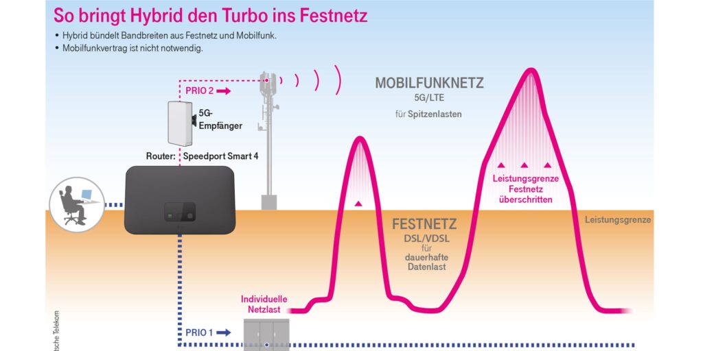 If you look at the technical descriptions, it sounds like this: The home gateway (i.e. the hybrid-capable router at home) works together with the hybrid access aggregation point (HAAP) during “bonding”. The HAAP is a special hybrid server in Telekom’s mobile network. The two components, i.e. the Home Gateway and the HAAP, share and bundle the data streams using software. Two separate tunnel connections are set up: one via DSL/VDSL and one via mobile communications (5G / LTE). These tunnels are then merged in the router to provide a seamless connection.