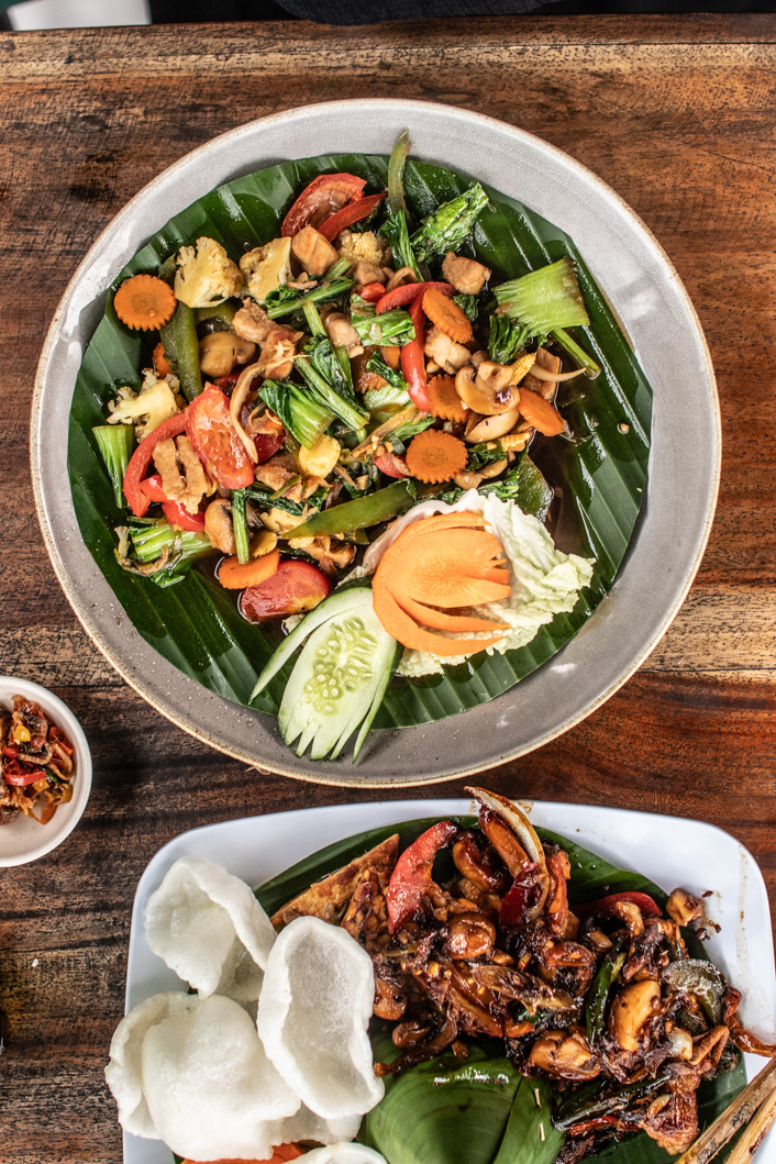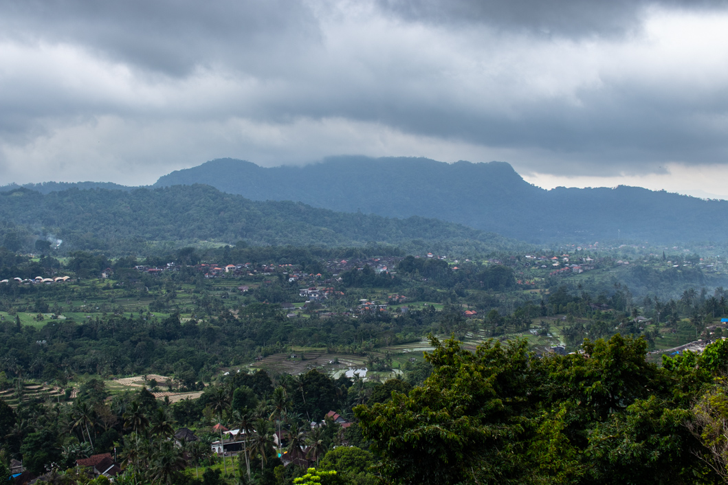 I’m actually the only guest this evening. A driver brought me here and I didn’t really realize that the small restaurant offers the most spectacular view of the Sidemen valley. It’s a simple one Warunga family-run restaurant right on the street. I sit under a tin roof and look out over the entire valley. Rain clouds are gathering, as they usually do in the early evening. Deciding what to order is difficult. Everything is tempting. Lots of fresh vegetables and tempeh. Tempeh is one of the reasons that brought me here. I want to discover how they transform this rather neutral tasting ingredient into something exciting. And as I take the first sips of my ice-cold Bintang beer (Indonesian and owned by Heineken), it starts to rain. Not just a shower, a real shower. And the mountains before my eyes sink behind a veil of water. What a panorama!