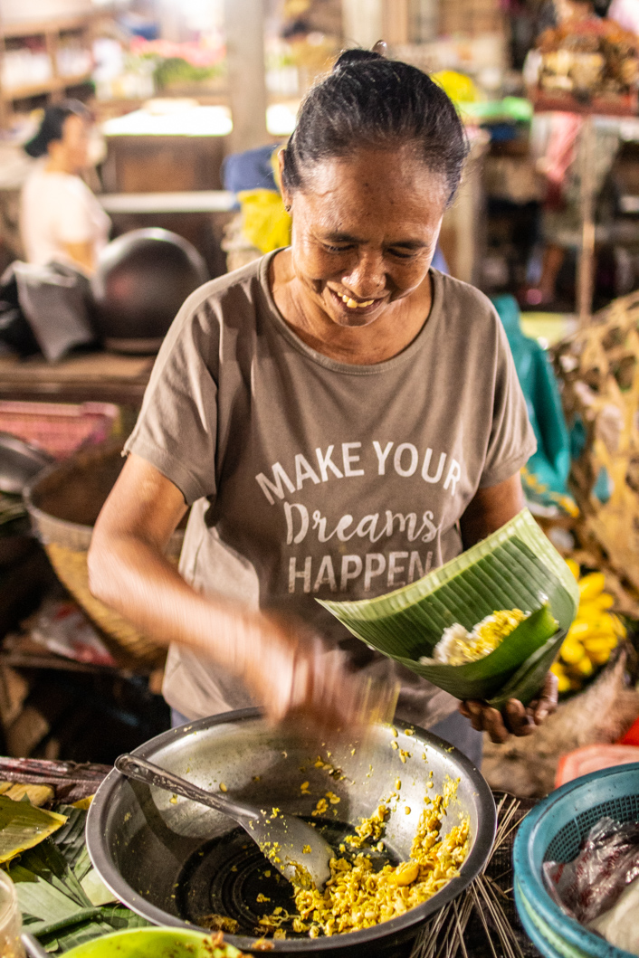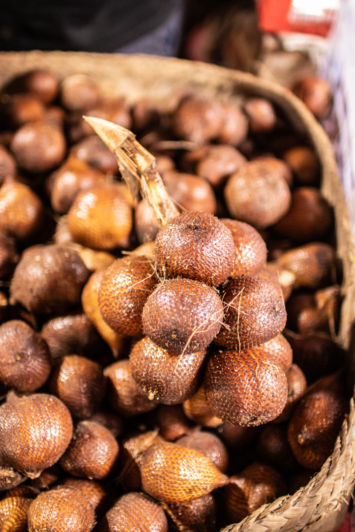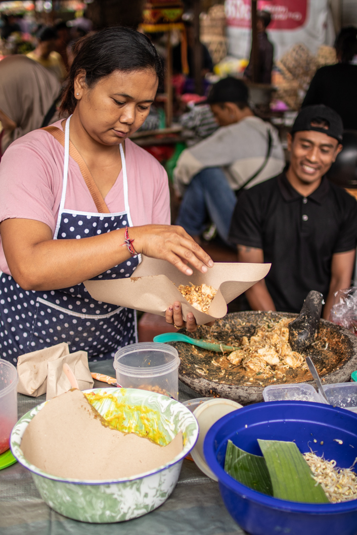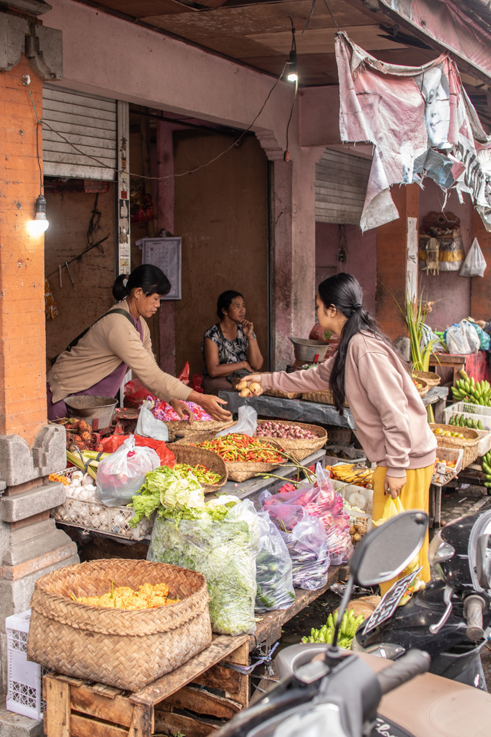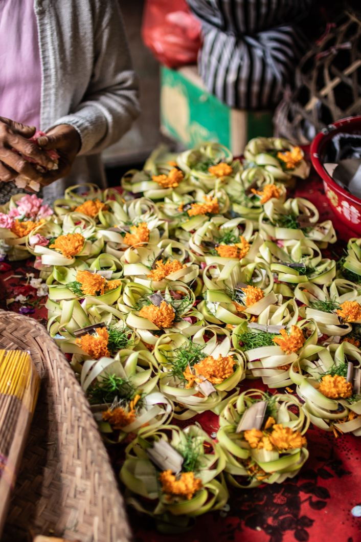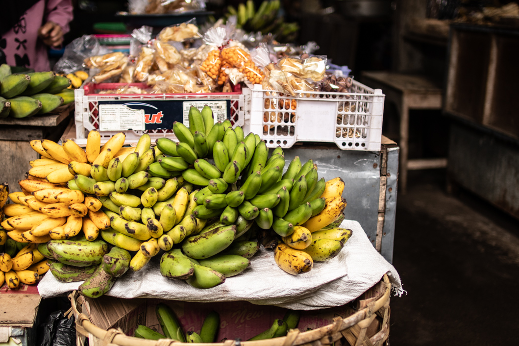 Of course I have to go to the market. I always have to go to the market. In the small town of Sidemen there is a market every day, but only in the morning hours. Everything is over by 10:00 a.m. So I have to get out early. Everywhere there is braiding and flowers being plucked. Flowers and small woven baskets are omnipresent in Balinese everyday life. They are Offerings for the gods. Every morning these pretty little works of art appear in front of the doors of houses, shops and of course temples. There will be here Snake Fruits sold that I didn’t know there were different varieties. The larger ones are sour and come from Bali, the smaller and sweet ones are from Java. Both Bananas My driver, who drove me to the market, raves about the small, light milk bananas here Pisang Susu called. They are supposed to be incredibly creamy. In fact, there are other variants in addition to the 5 main varieties. Plantains, sacrificial bananas, dessert bananas – as if they were different fruits.