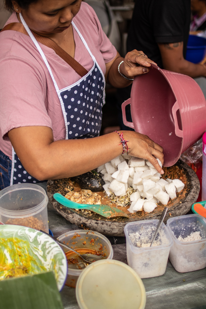 And then watch, fascinated, how routinely peanuts are ground with garlic and chilies to make a peanut sauce. I would also like a mortar like that. He’s huge. This peanut sauce is mixed with mung bean sprouts, beans and rice cakes. Tipat cantok is the name of the dish and it is eaten cold. I take a portion and am thrilled. This Rice cake therein are a real discovery. I found my first favorite dish.