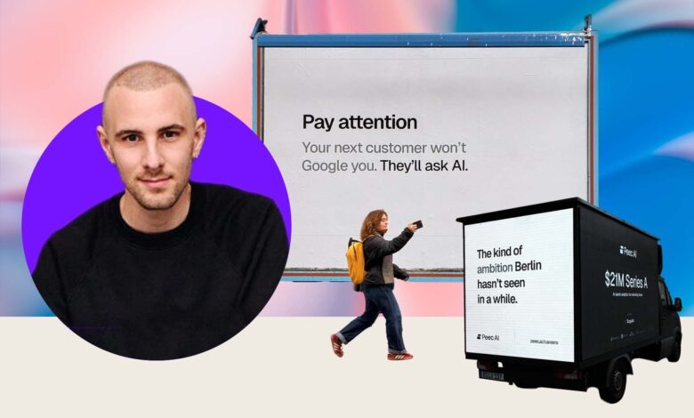 A startup self-confidence that is rarely seen in Germany. Anyone who has walked through Berlin-Mitte or Prenzlauer Berg in the past few months has hardly been able to pass them. Black and white, minimalist, on flyers, advertising pillars, meter-high posters, on glowing trucks and even on the ground: the campaign by the Berlin AI startup Peec AI.